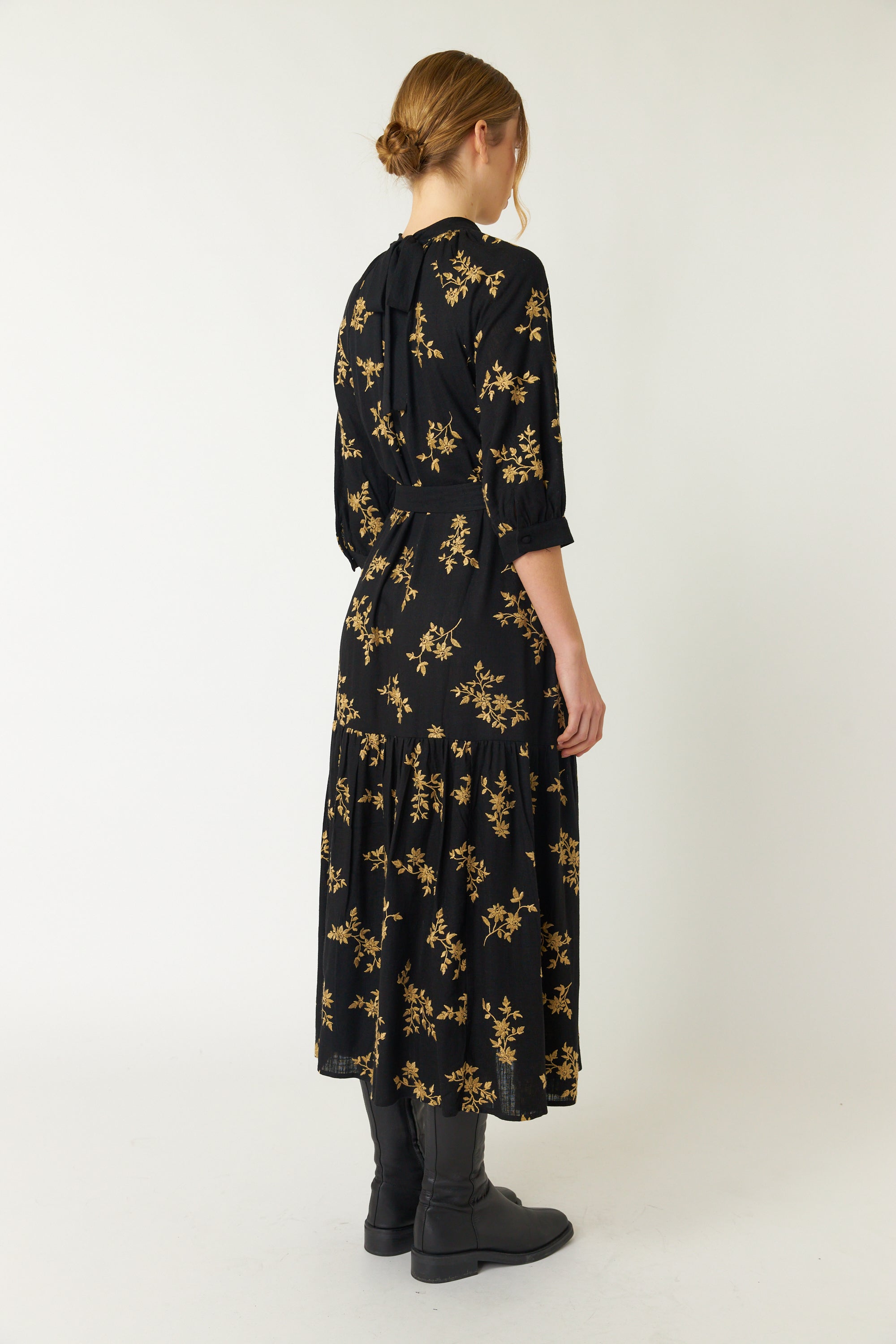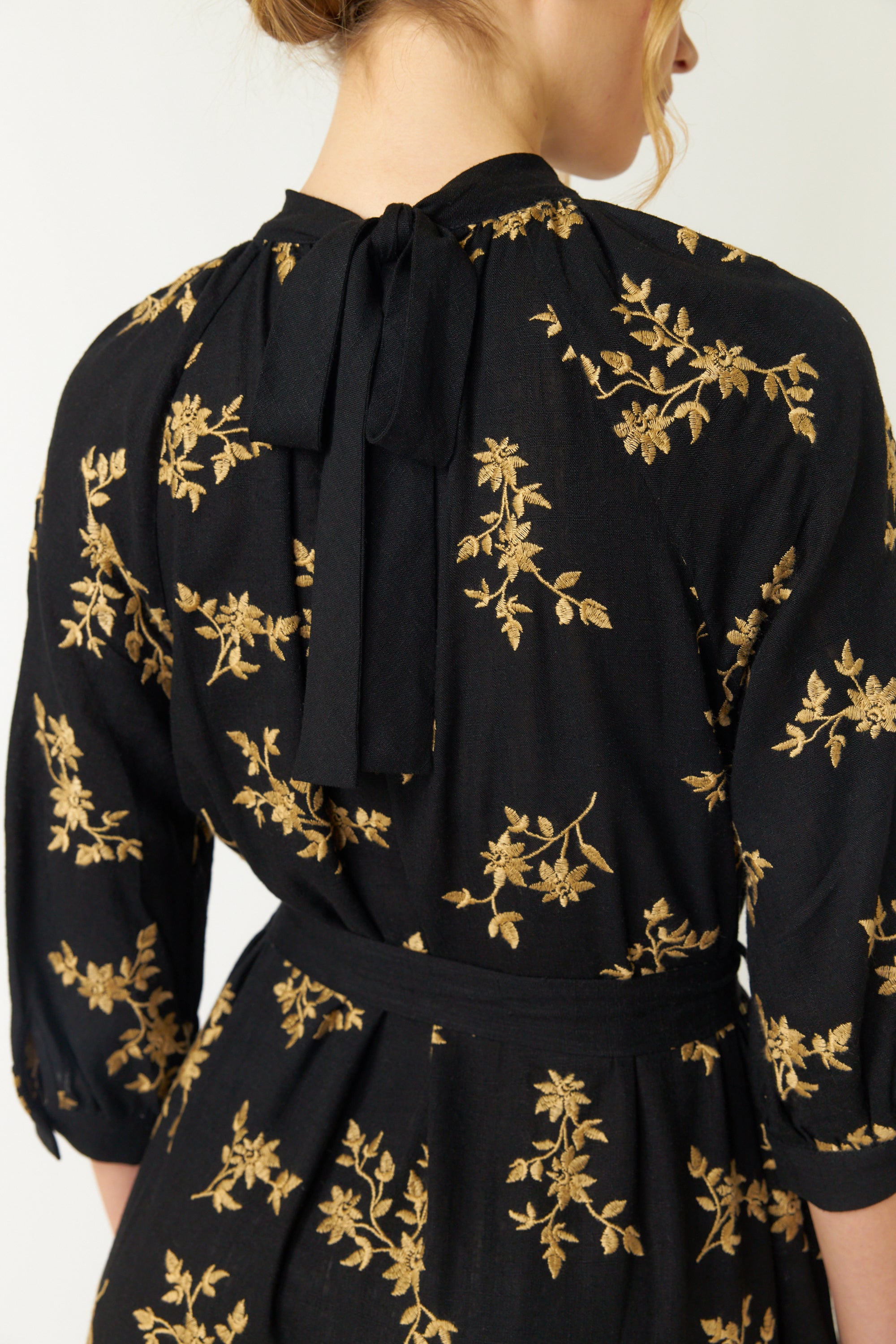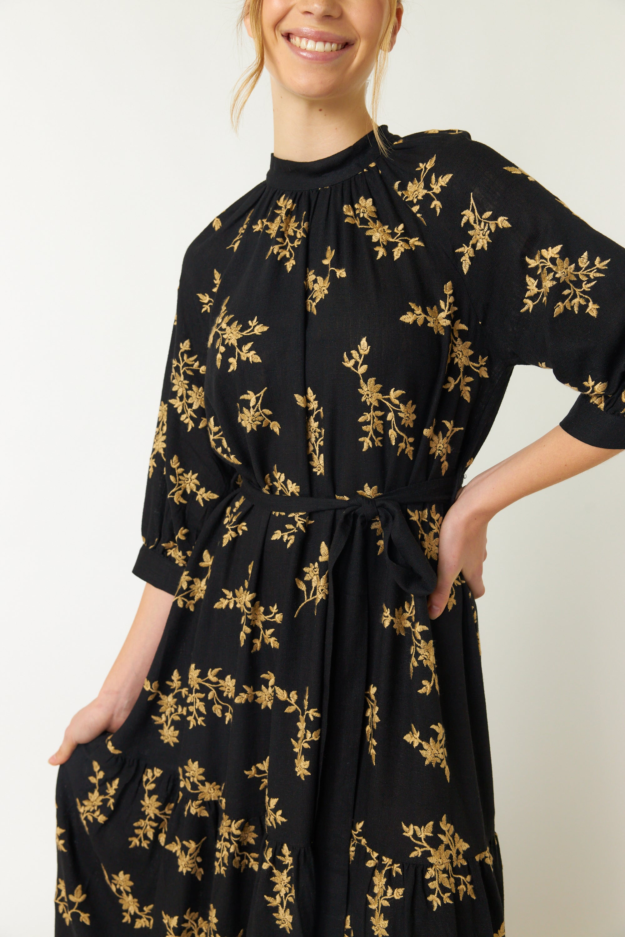 Our Blooms midi dress features elegant embroidery. It is a very versatile style that can be worn belted or unbelted and features a high neck band that ties in a bow at the back with a matching tie belt. For ease, you have soft gathers at the neck, cuffs and through the tiered skirt, making this dress effortlessly elevated.