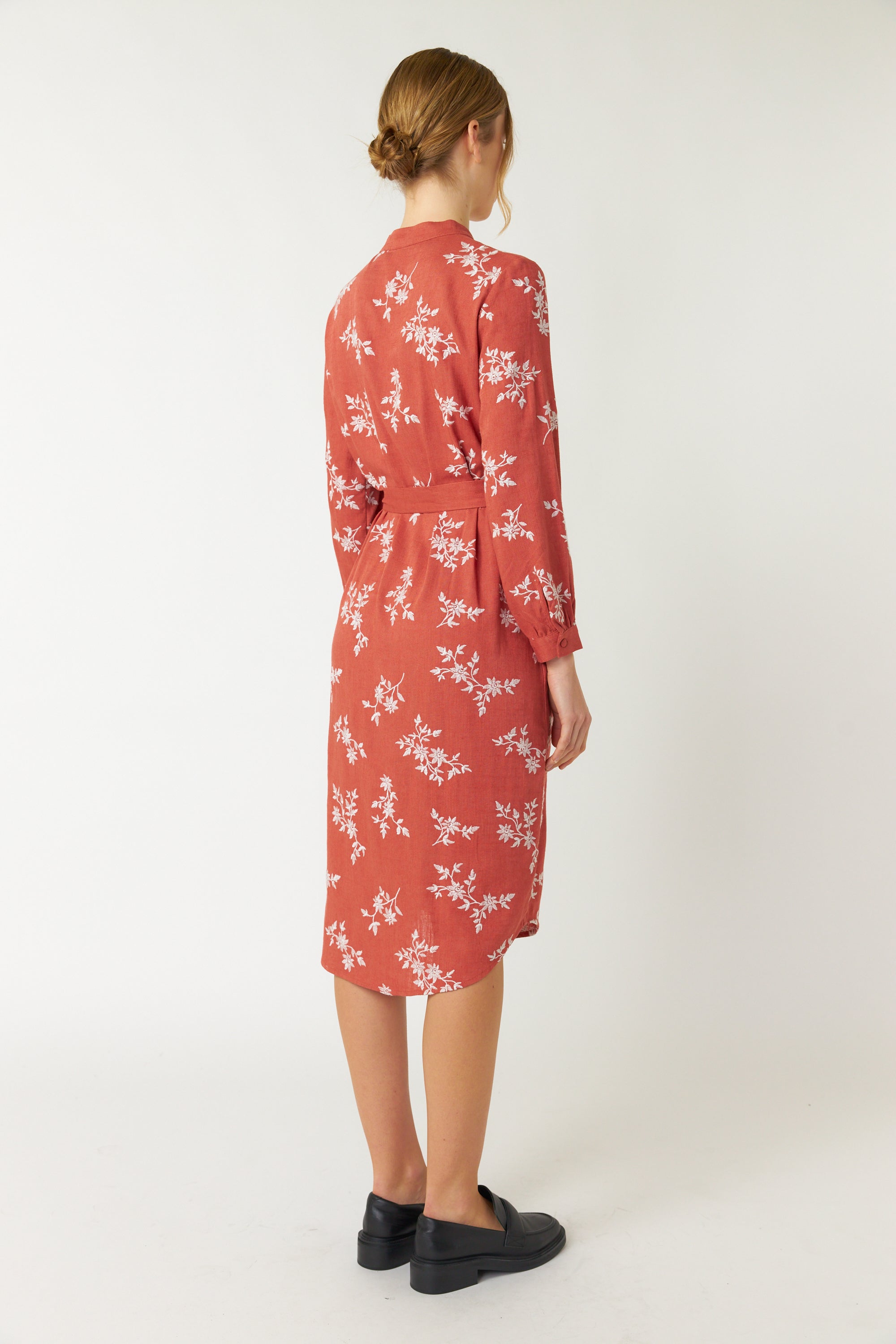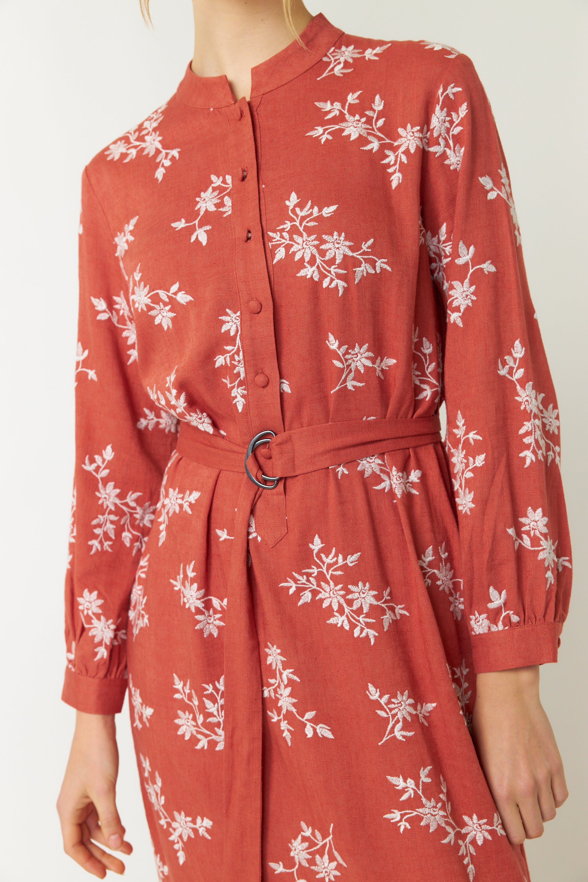 Our Blooms shirt dress is elevated with an elegant blooms embroidery. The dress features a collar stand and button placket through to waist. This dress is mid calf length and comes with a matching belt and sleeves that gather onto a tailored cuff. This is a dress that can effortlessly take you from café to work and then onto a dinner out. Layered here with our