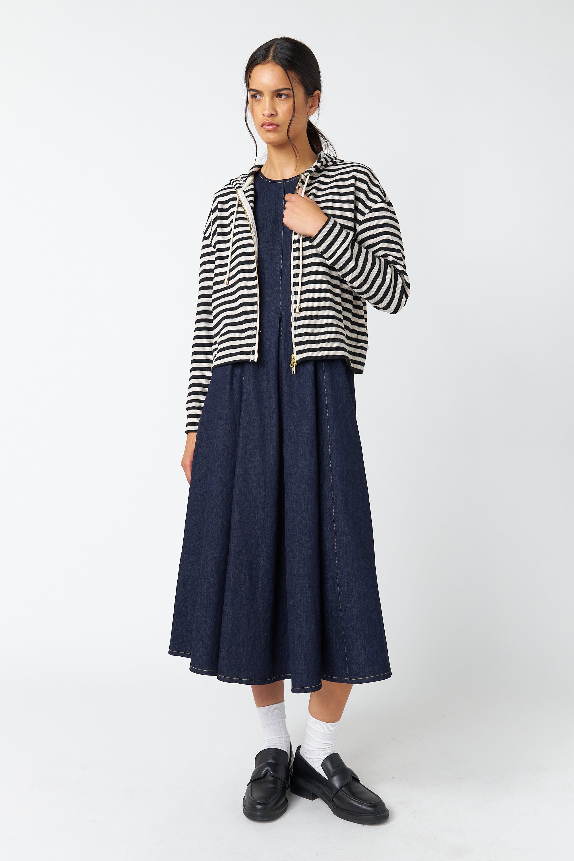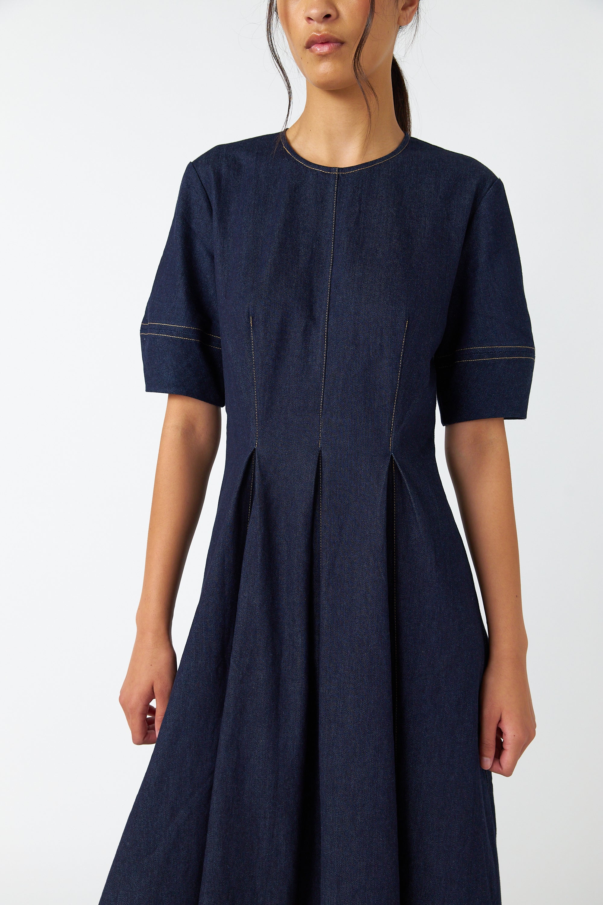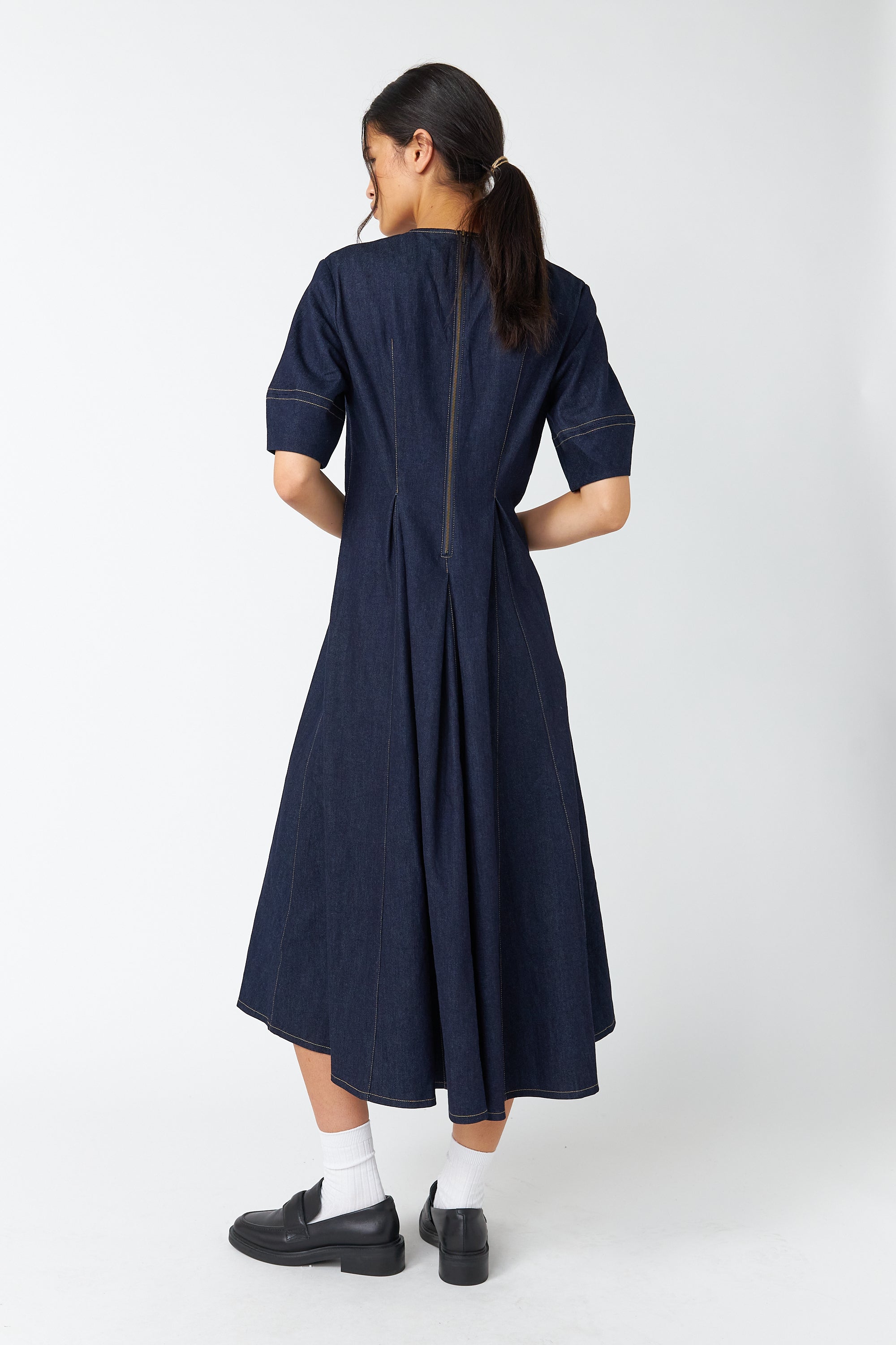 The Denim godet dress is a very flattering dress featuring tucked waist shaping and godet pleats to create a gently flared silhouette. The dress has a round neck, metal zip in the back, unique lantern-shaped sleeves, and is mid-calf length. It features contrast stitching throughout. Style with loafers or boots and our .