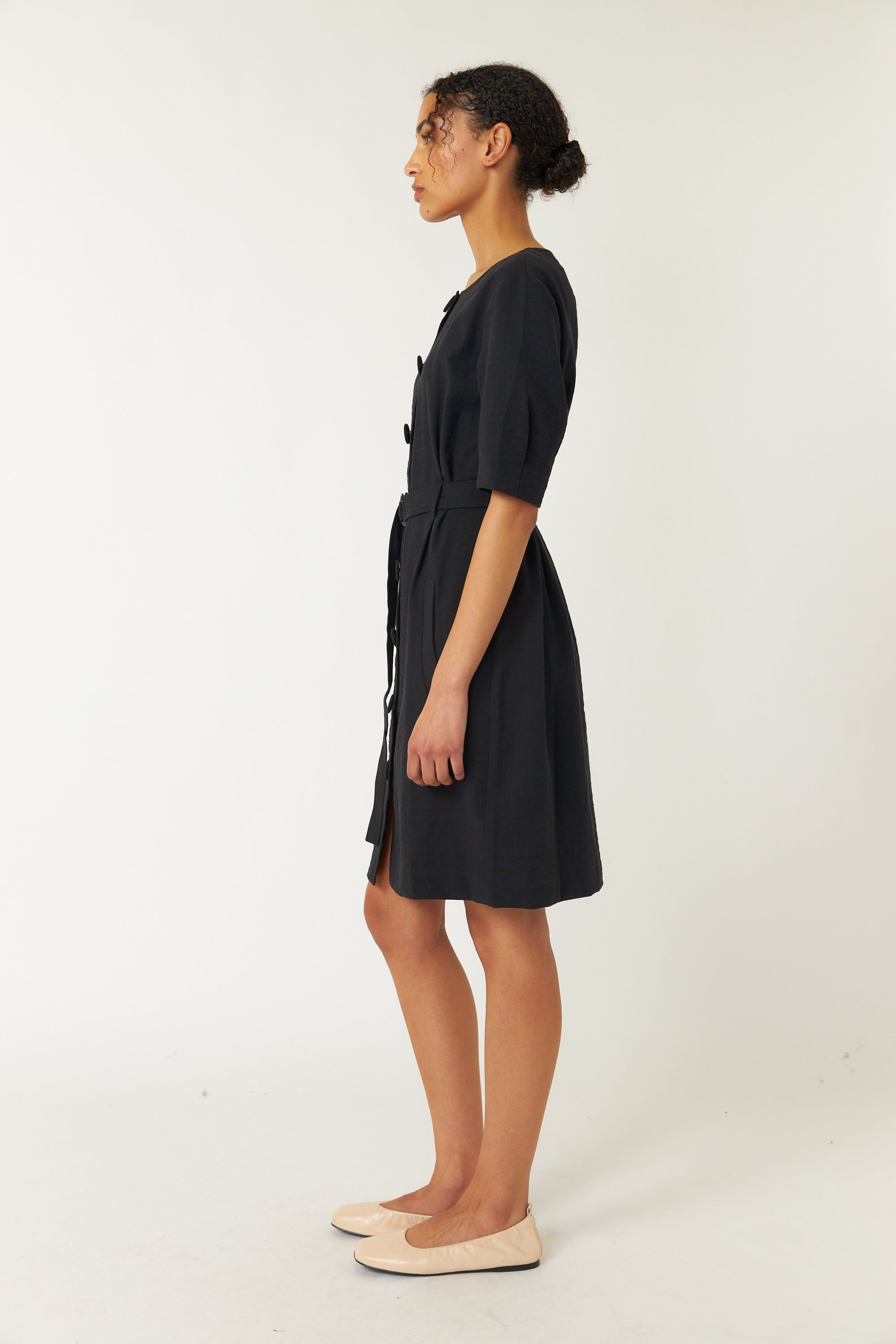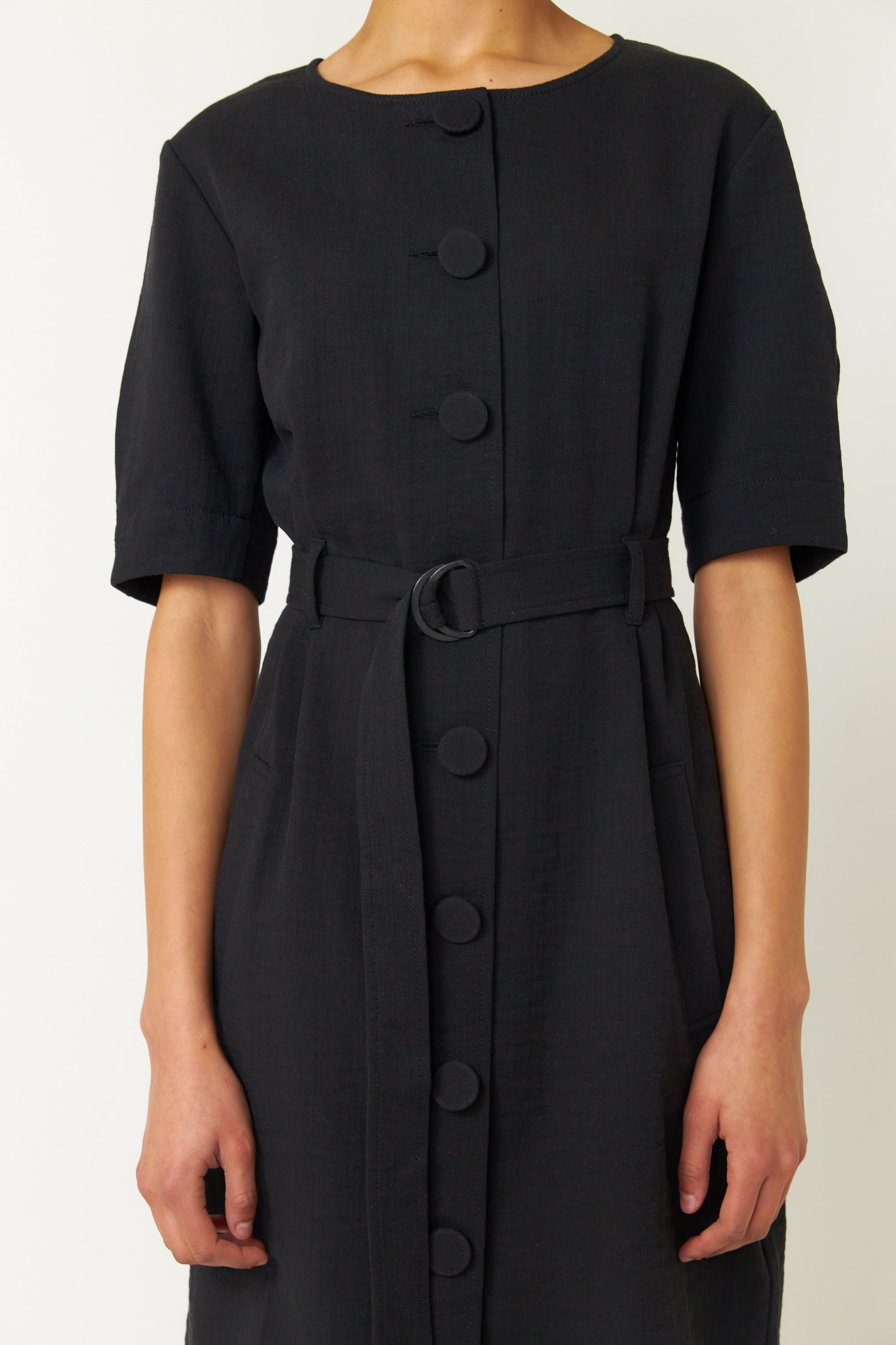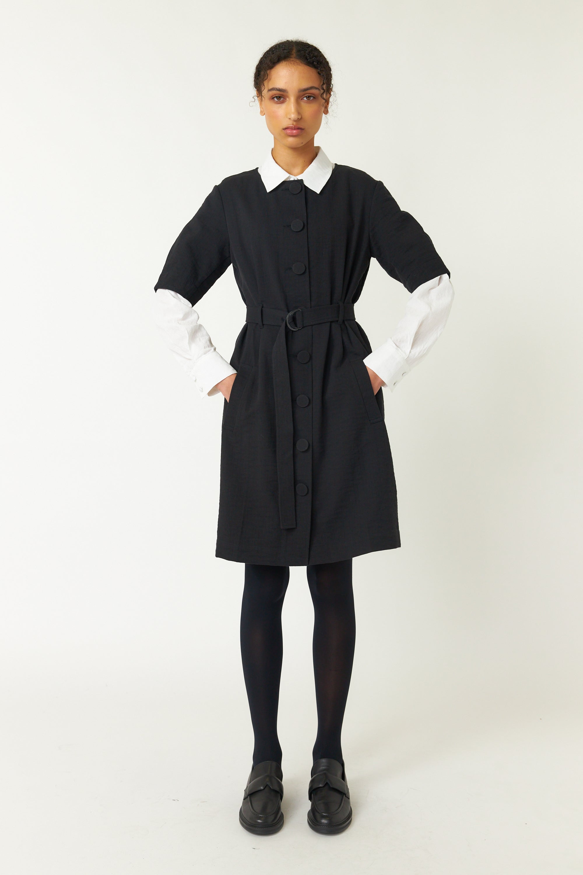 Our Modern lovers dress is an easy fit and finishes on the knee. It features large buttons through the front, a matching belt with D-ring closure and welt pockets. With elbow length sleeves this dress is great now layered up but will take you all the way through summer too. Wear on it's own for a effortless and classy look, or layer for winter with a our collared .