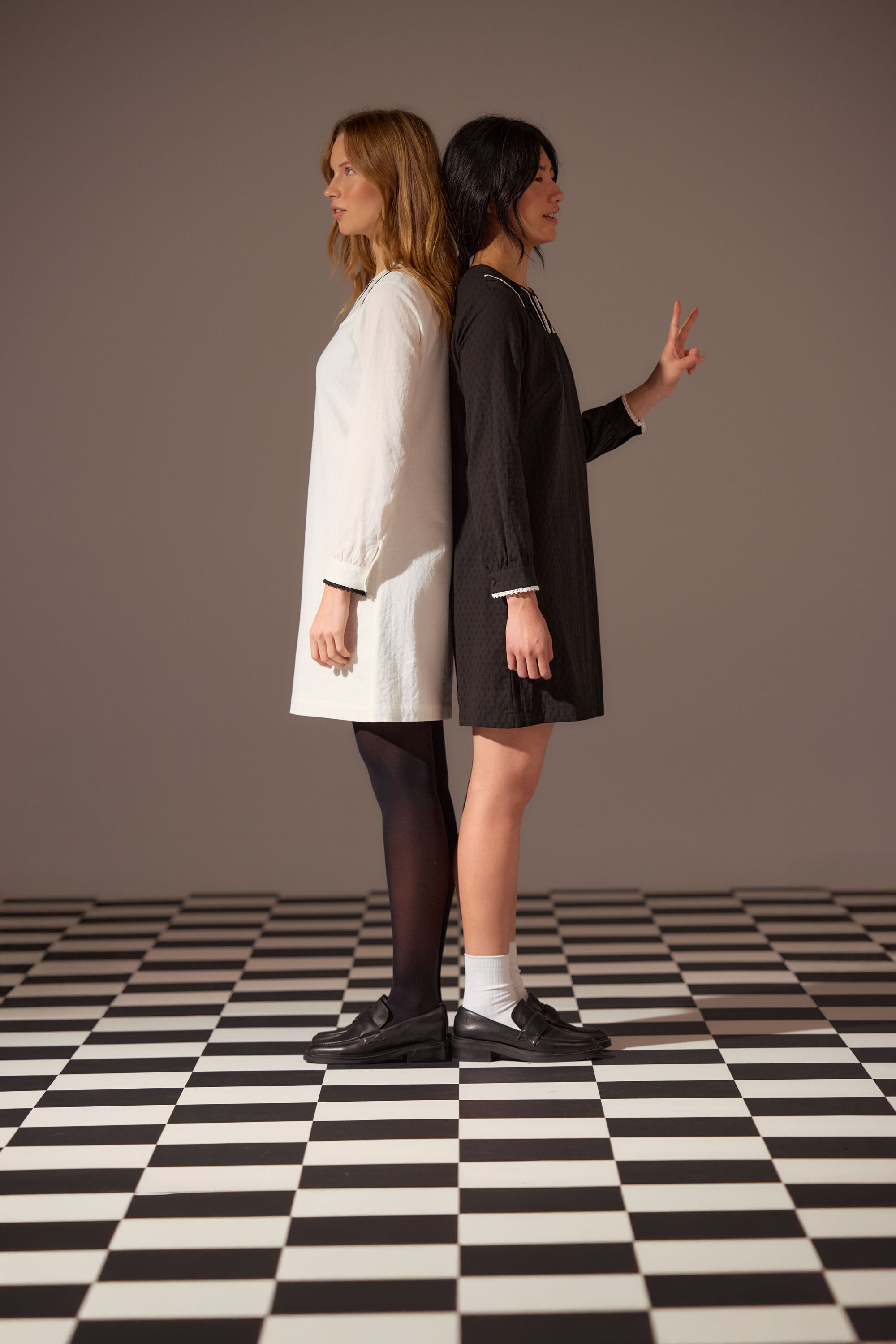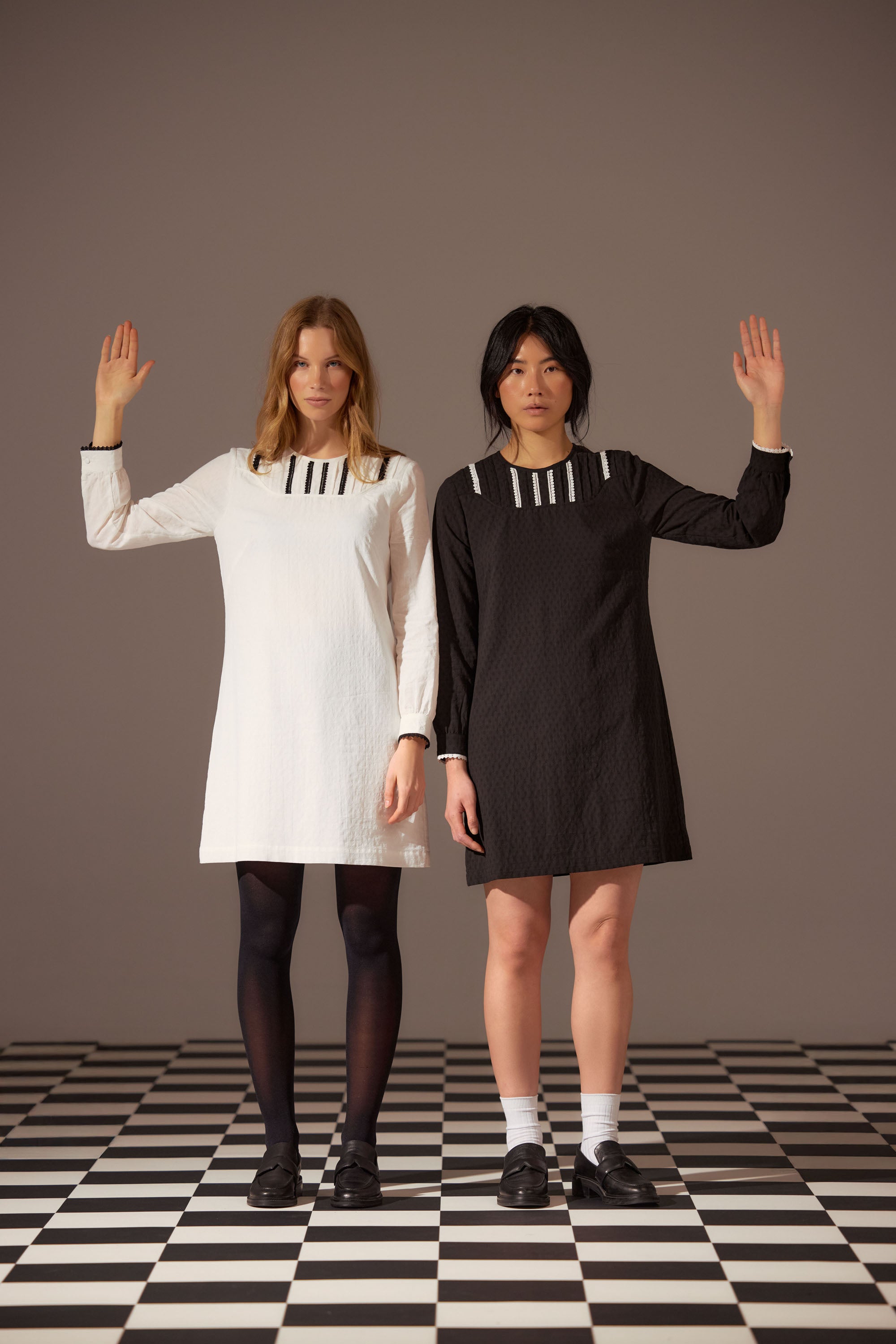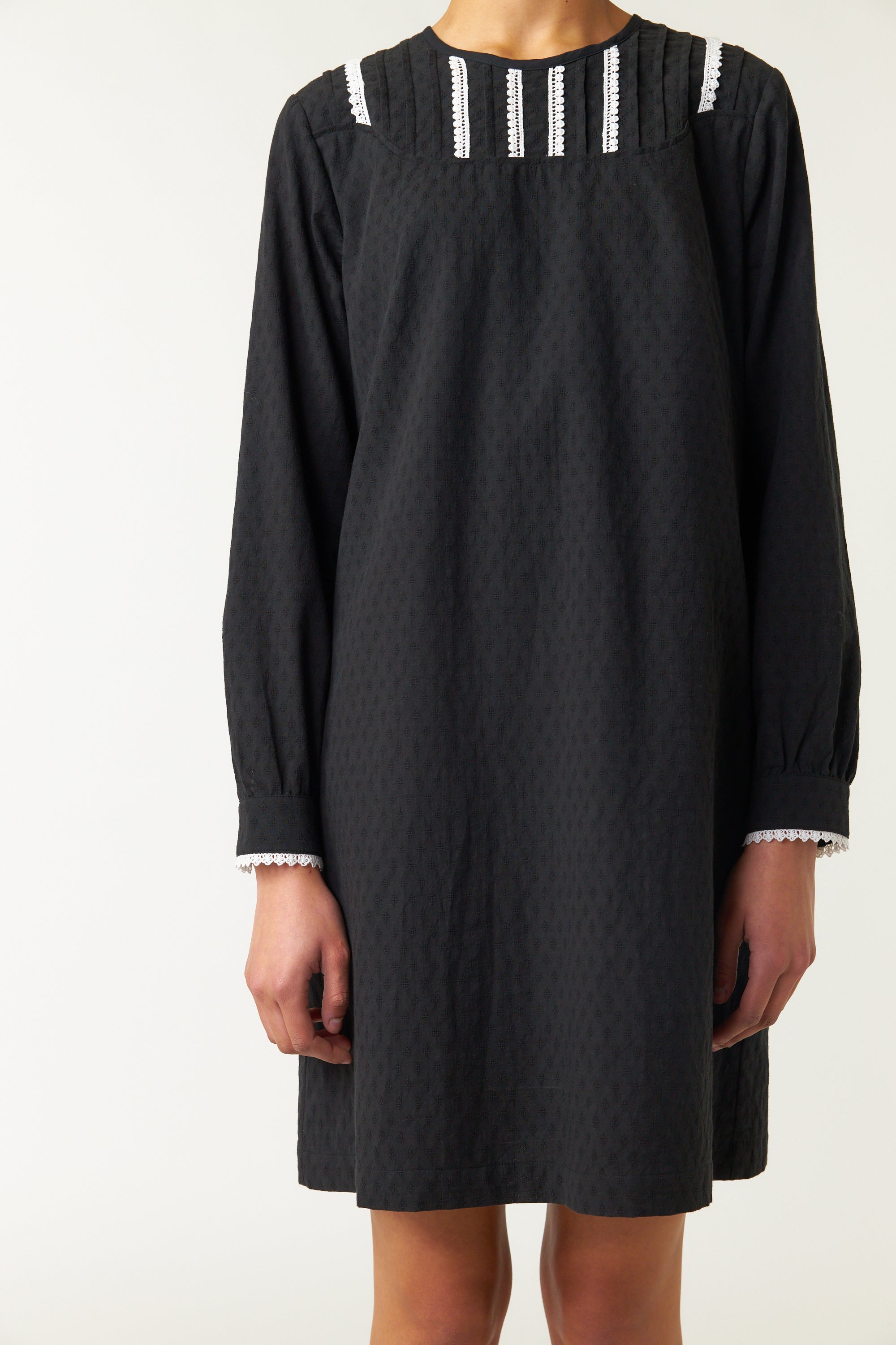 The Pintucked dress is a neat fitting A-line to the knee. The yoke features a charming detail of mixed pintucks and cotton lace trim. This lace trim also features on the sleeve cuffs.