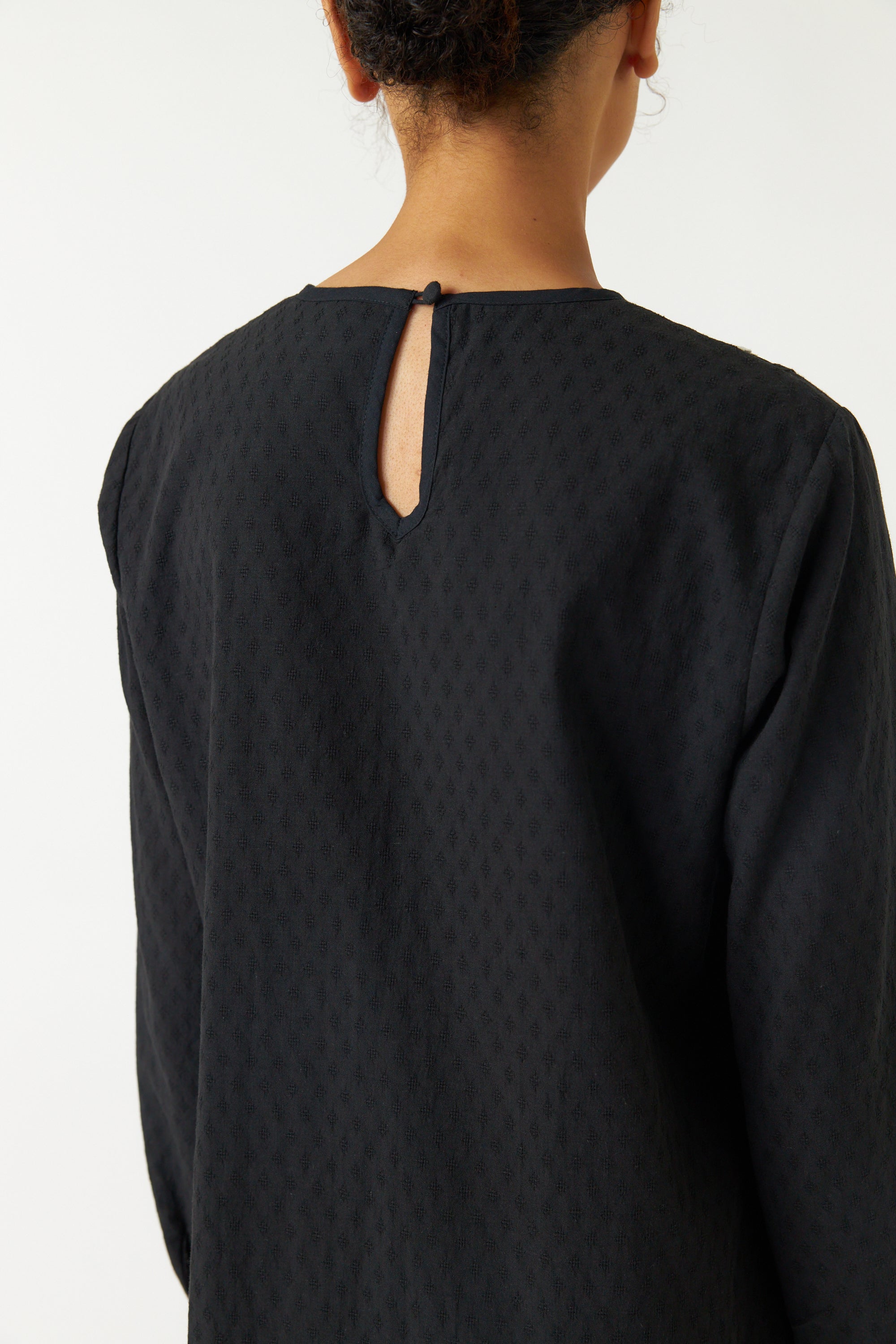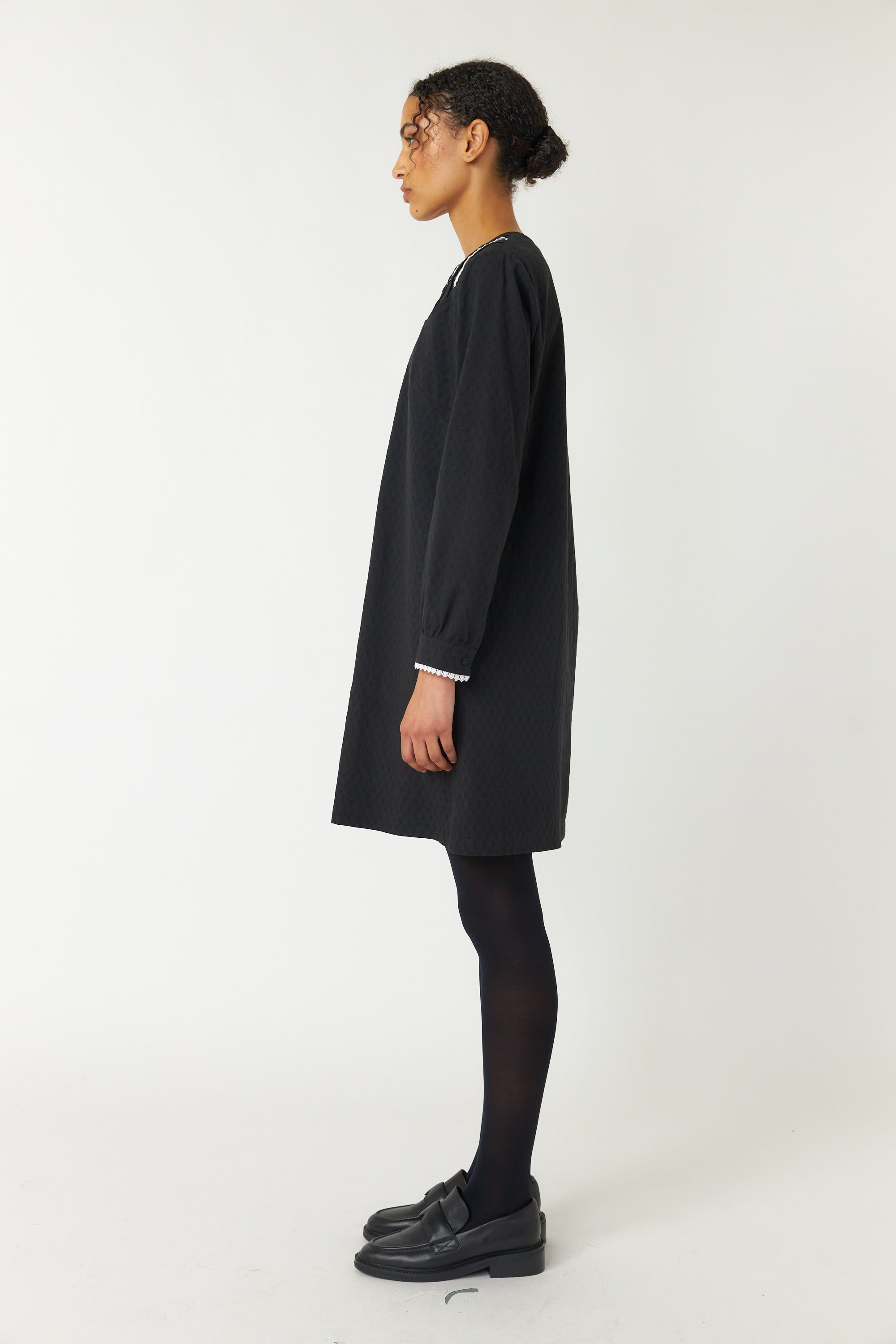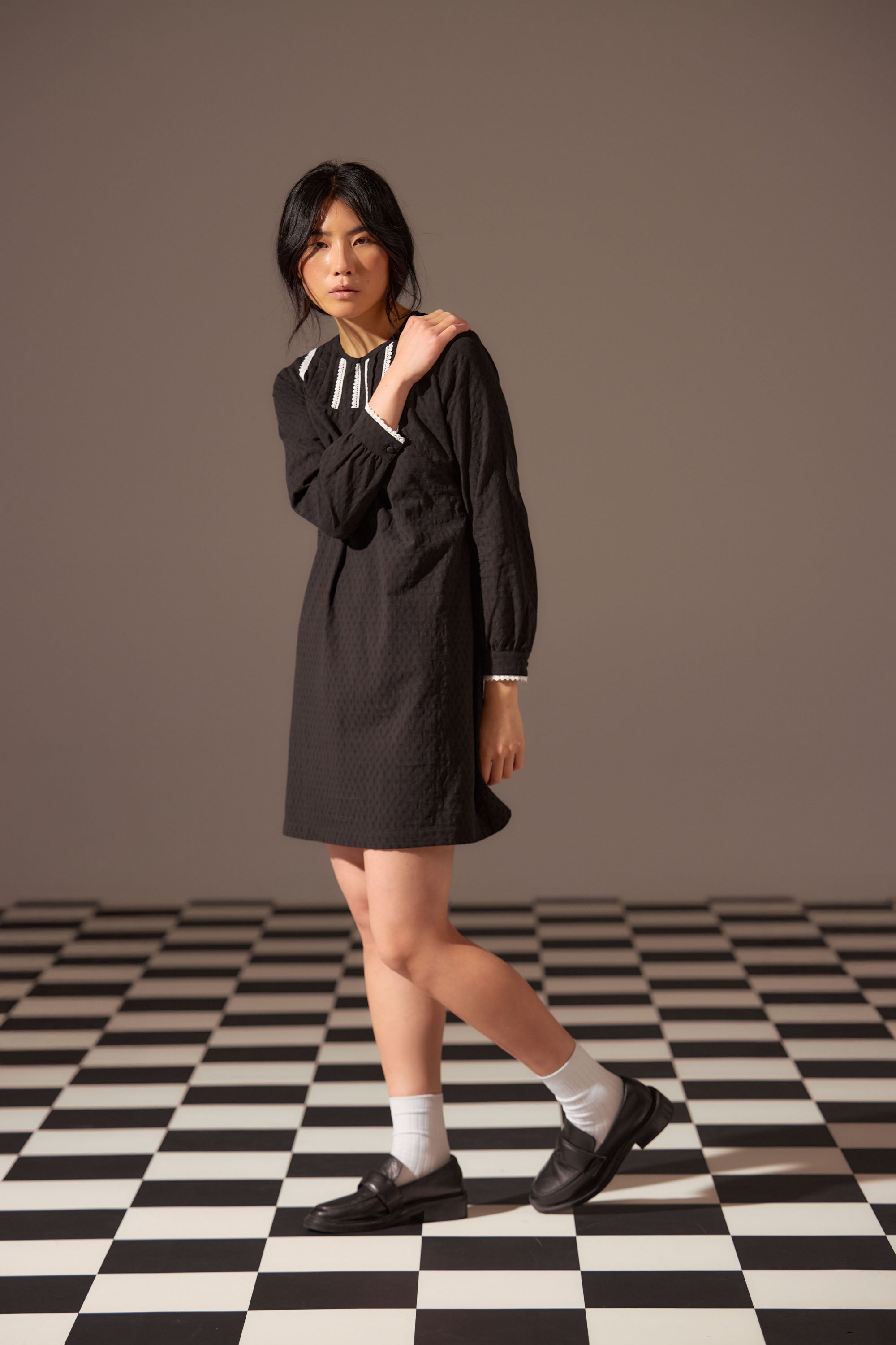 The Pintucked dress is a neat fitting A-line to the knee. The yoke features a charming detail of mixed pintucks and cotton lace trim. This lace trim also features on the sleeve cuffs.