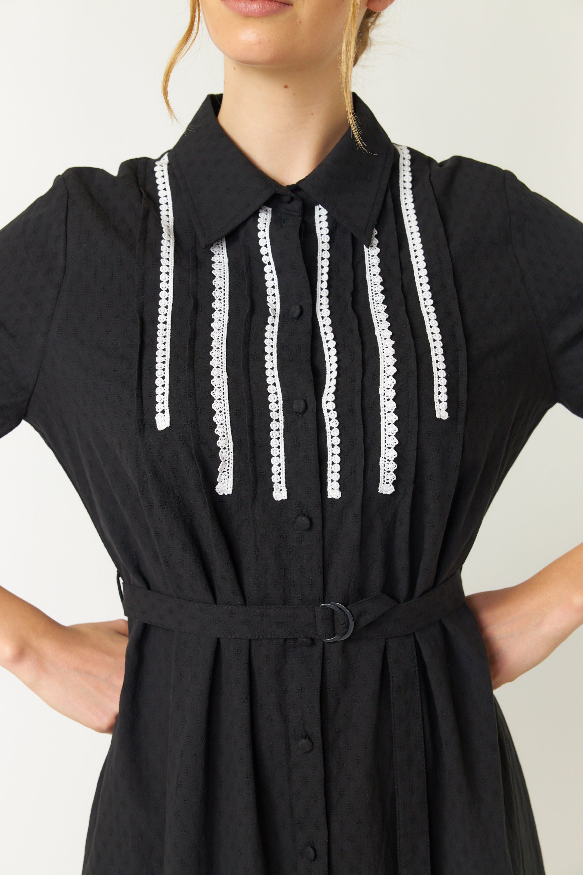 Our Pintucked shirt dress is an easy fit, midi length with charming attention to detail. The button through front and sleeve cuffs feature covered buttons. The front bib is a mix of pintucks and fine cotton lace trim in contrast colour. This dress looks great belted or unbelted.