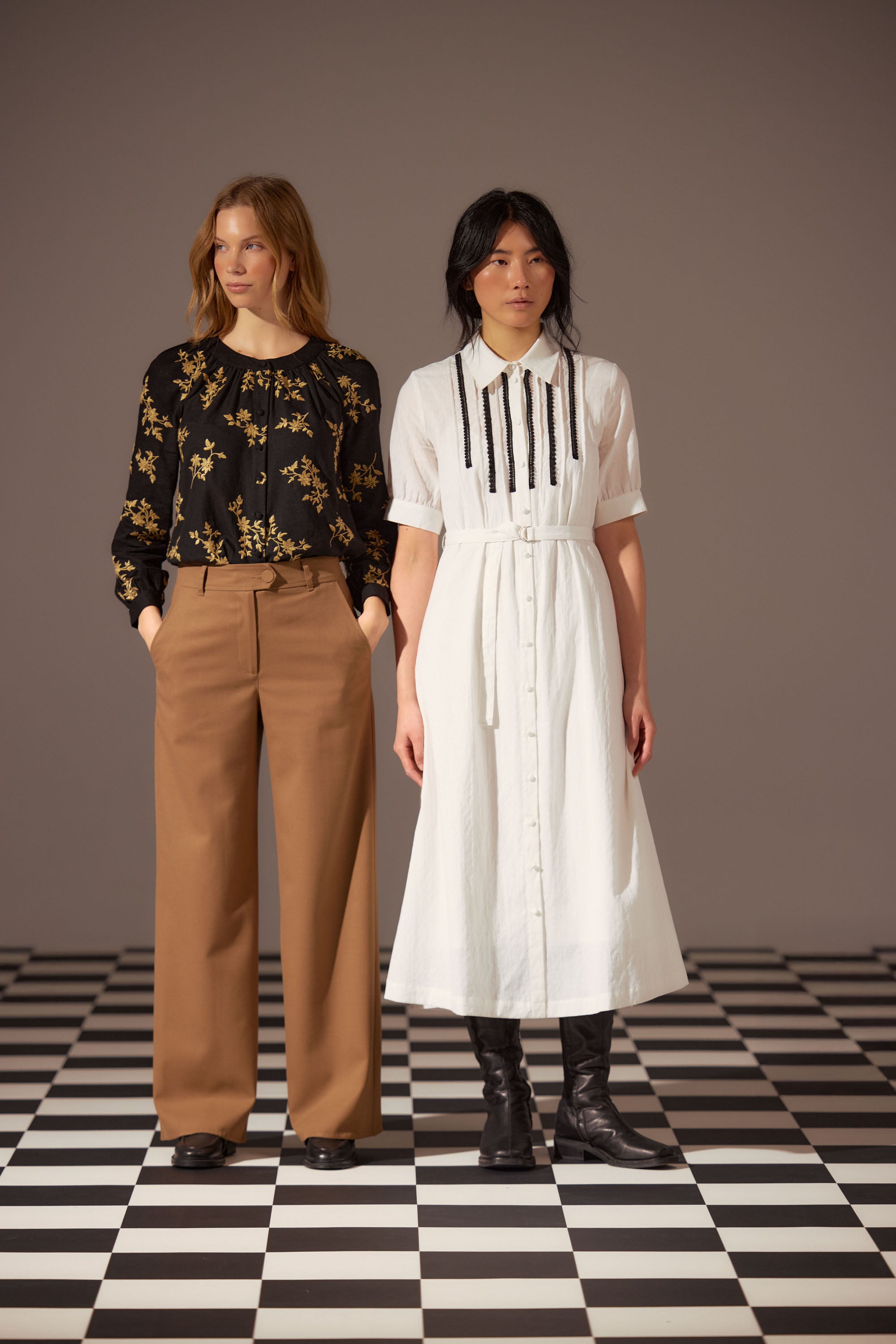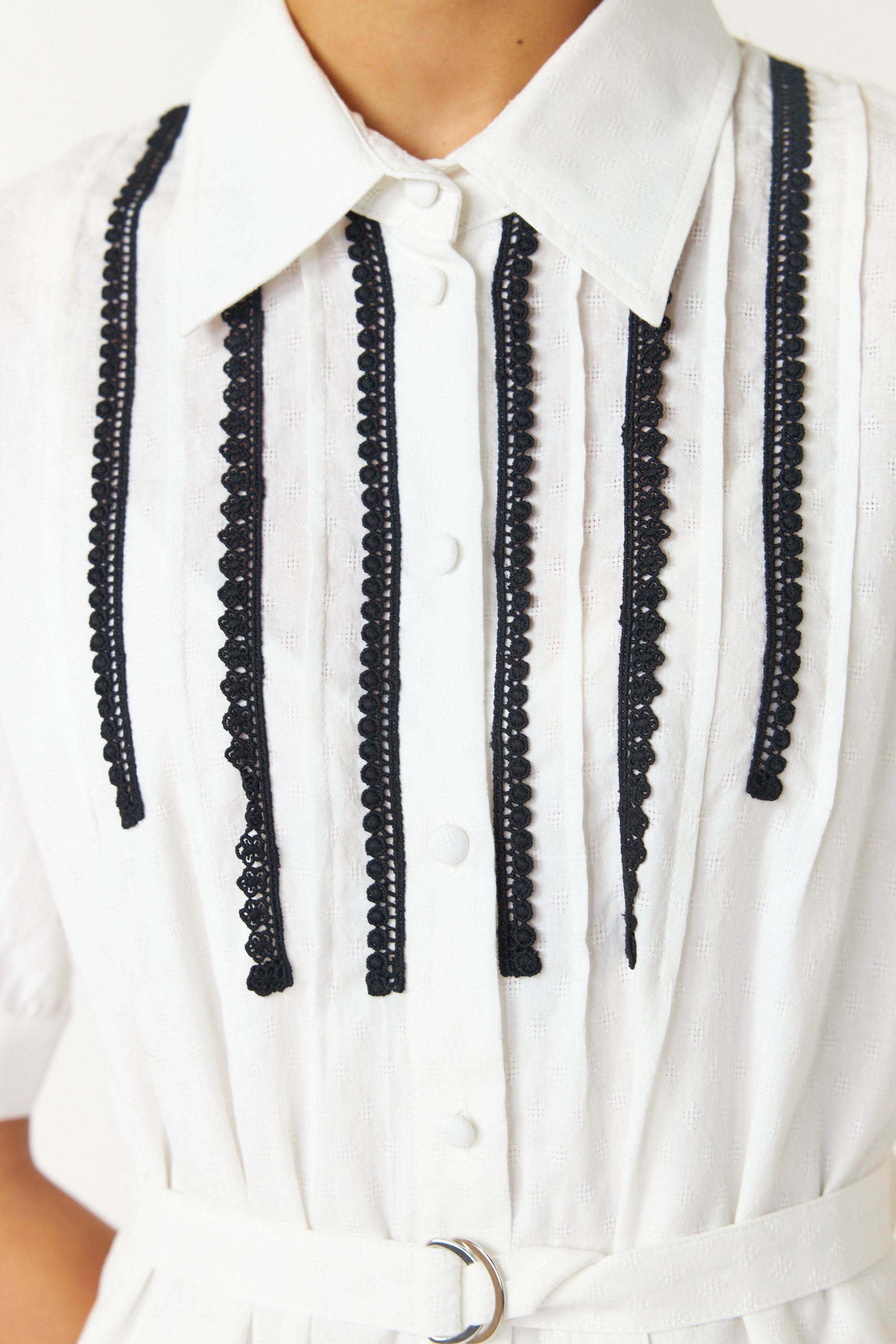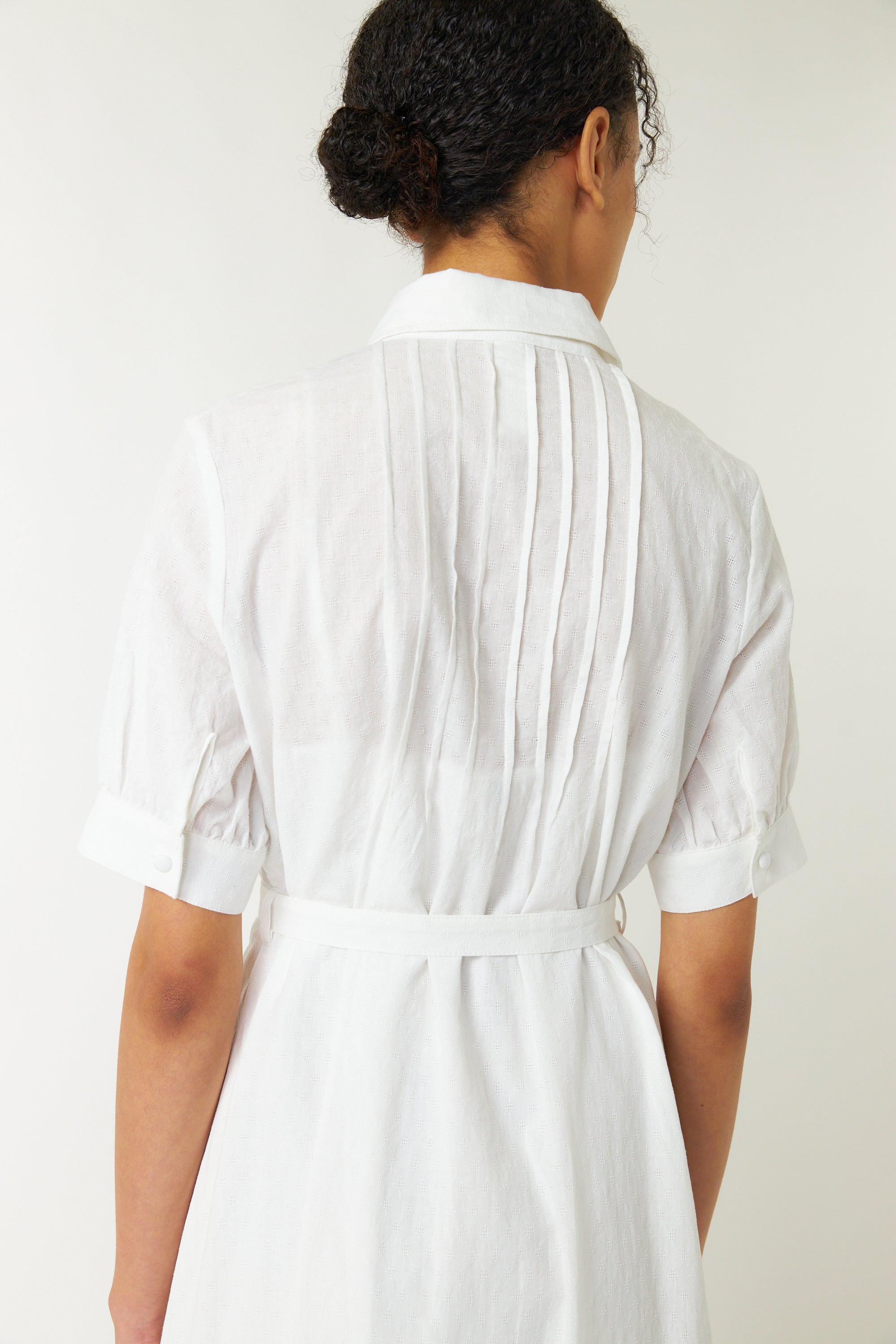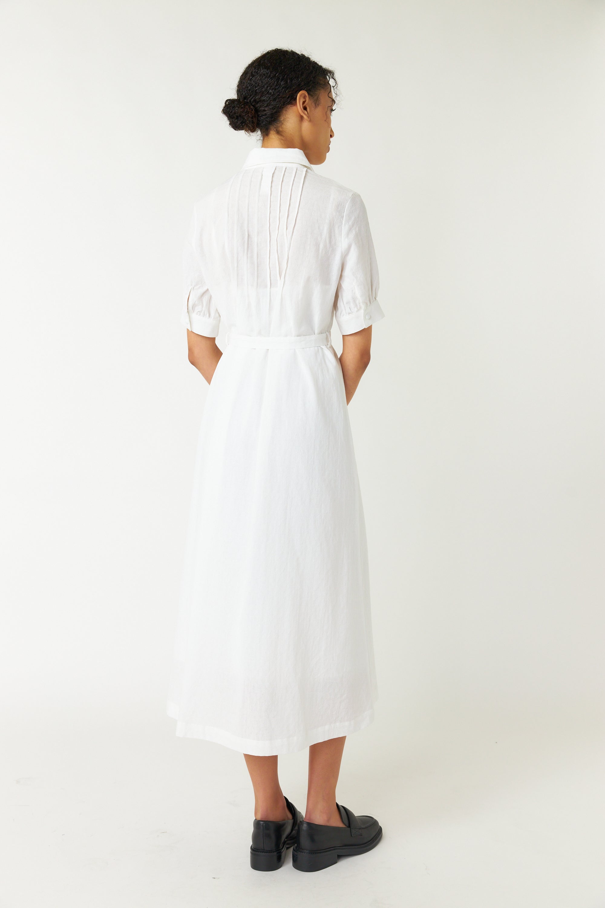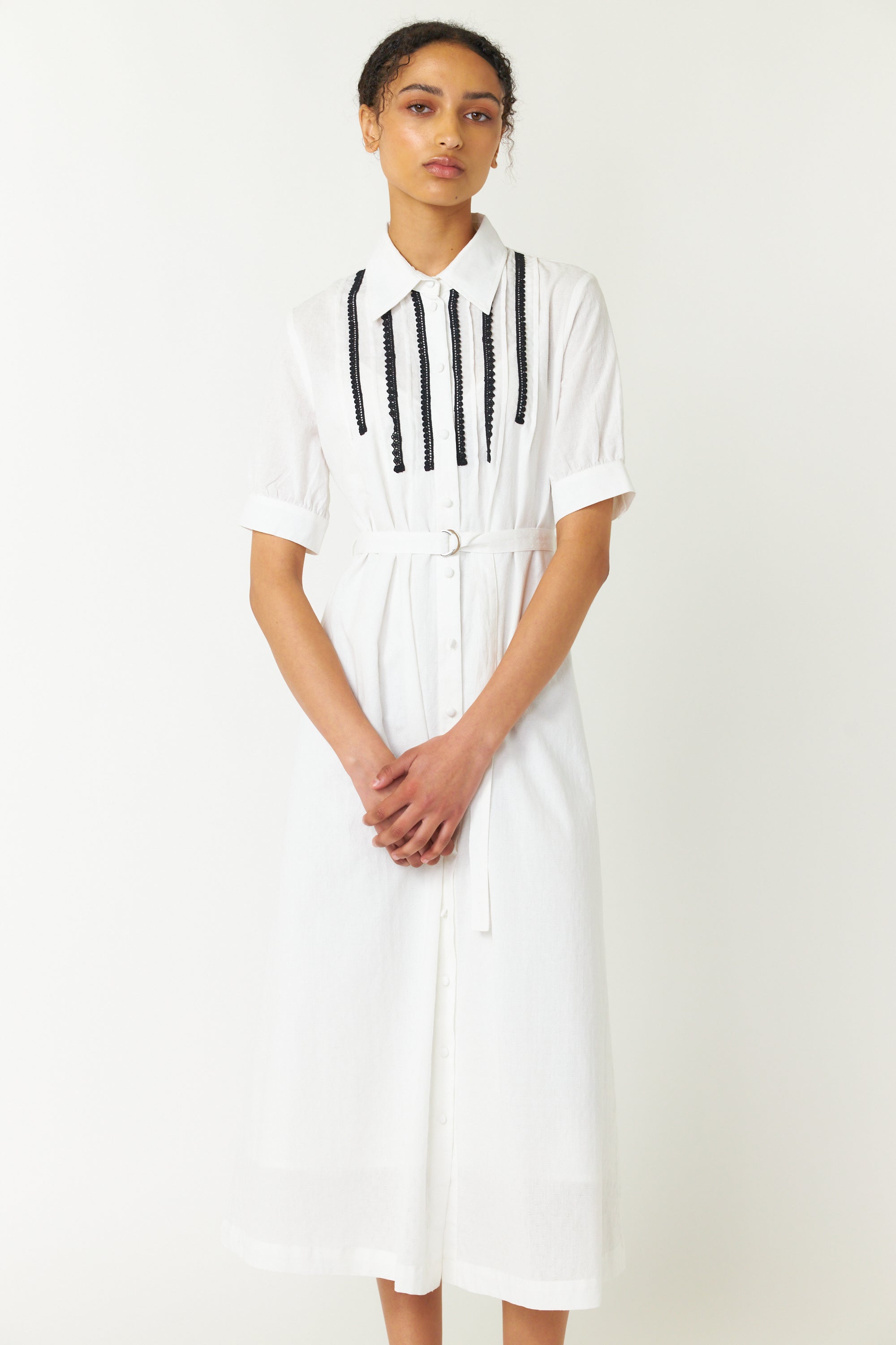 Our Pintucked shirt dress is an easy fit, midi length with charming attention to detail. The button through front and sleeve cuffs feature covered buttons. The front bib is a mix of pintucks and fine cotton lace trim in contrast colour. This dress looks great belted or unbelted.