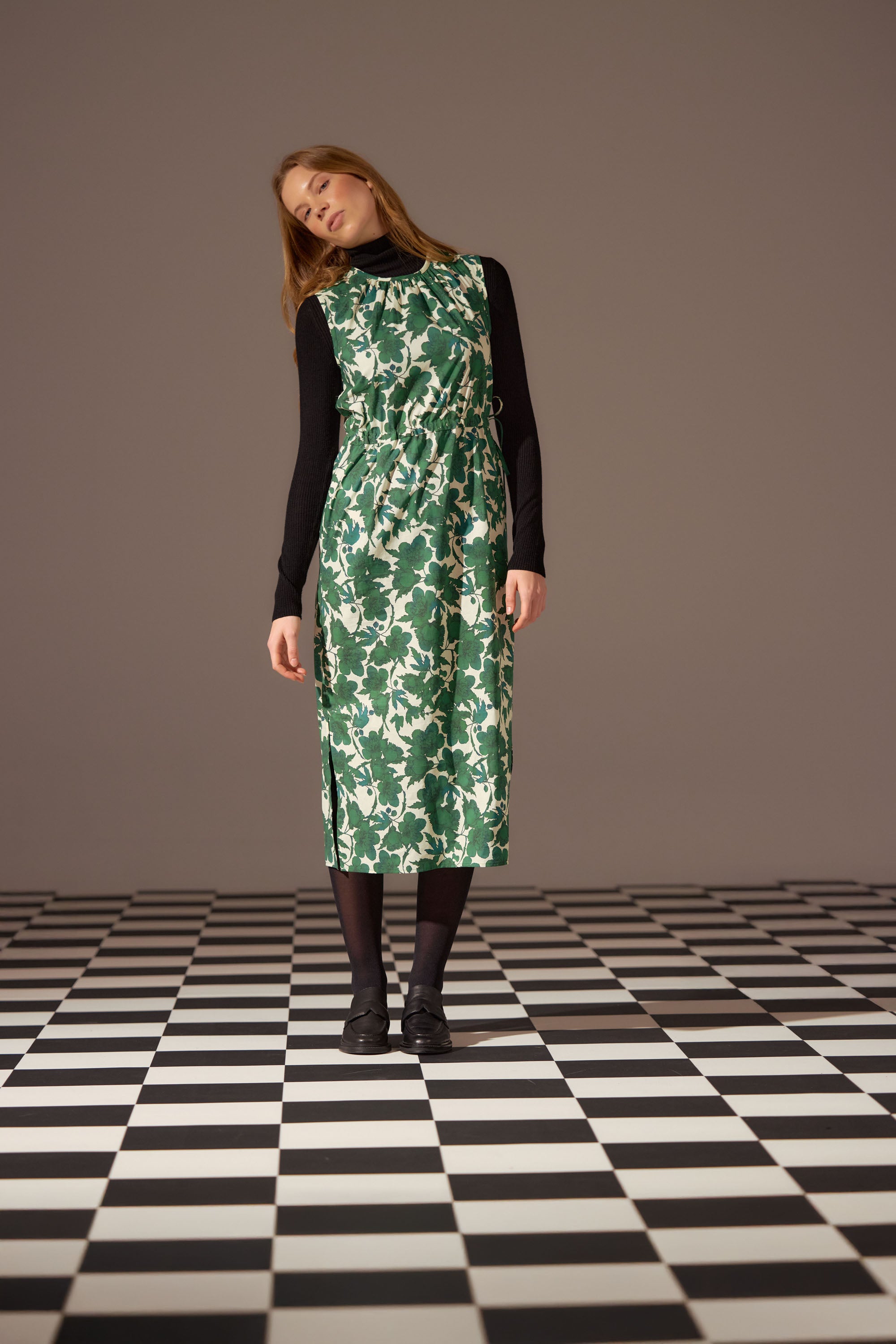 Our Wild rose dress looks great layered up for the cold but will transform into a sundress come summer. It is semi fitted and finishes mid calf with charming side splits in the skirt. There are soft gathers at the neck and an adjustable drawstring at the waist so it's effortlessly comfortable. Wear with our underneath for a easy weekend outfit.