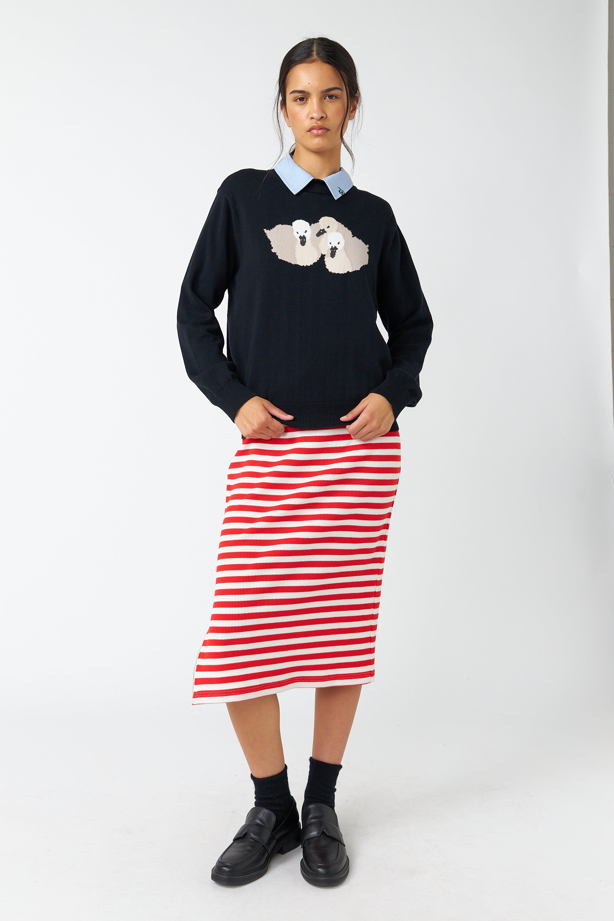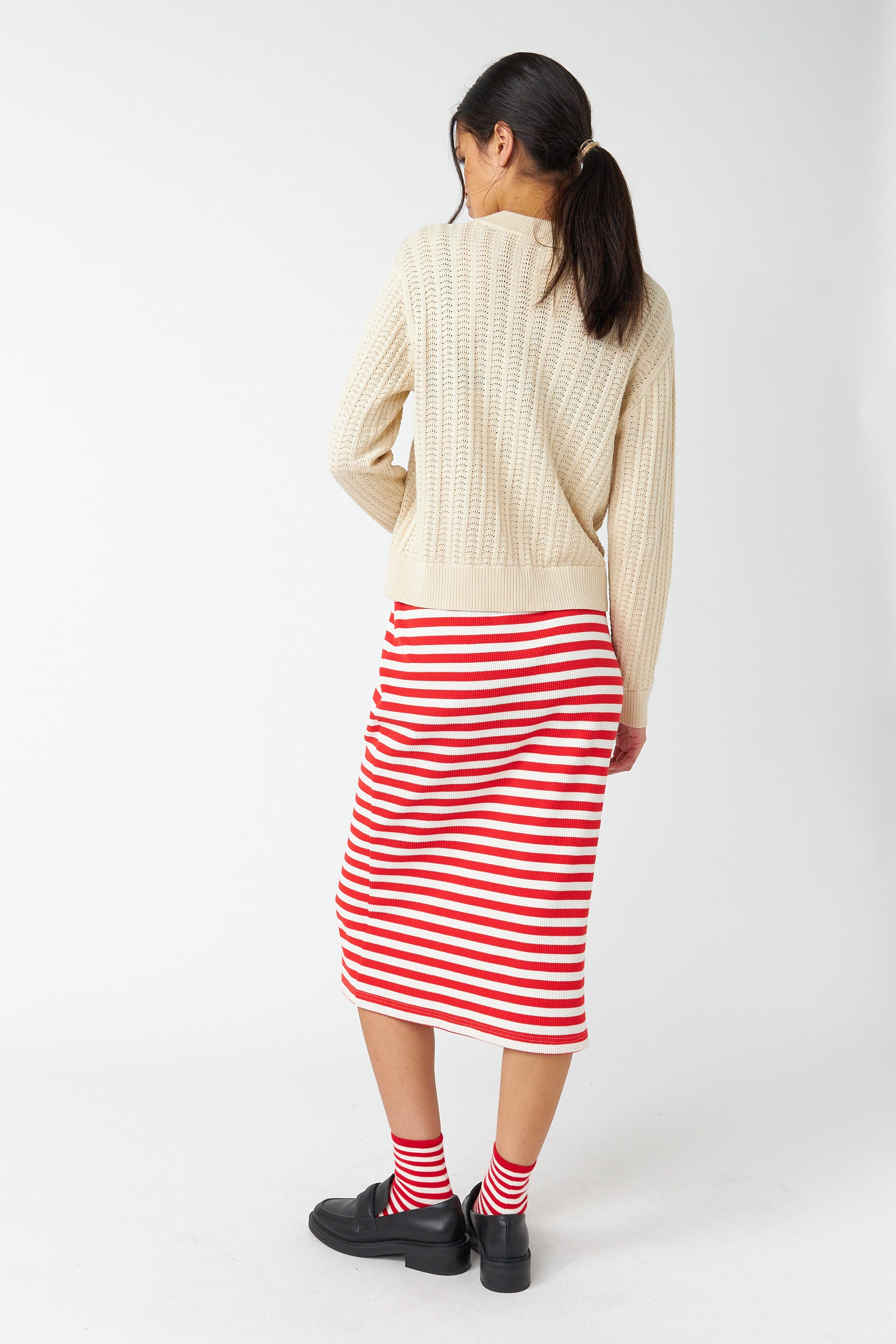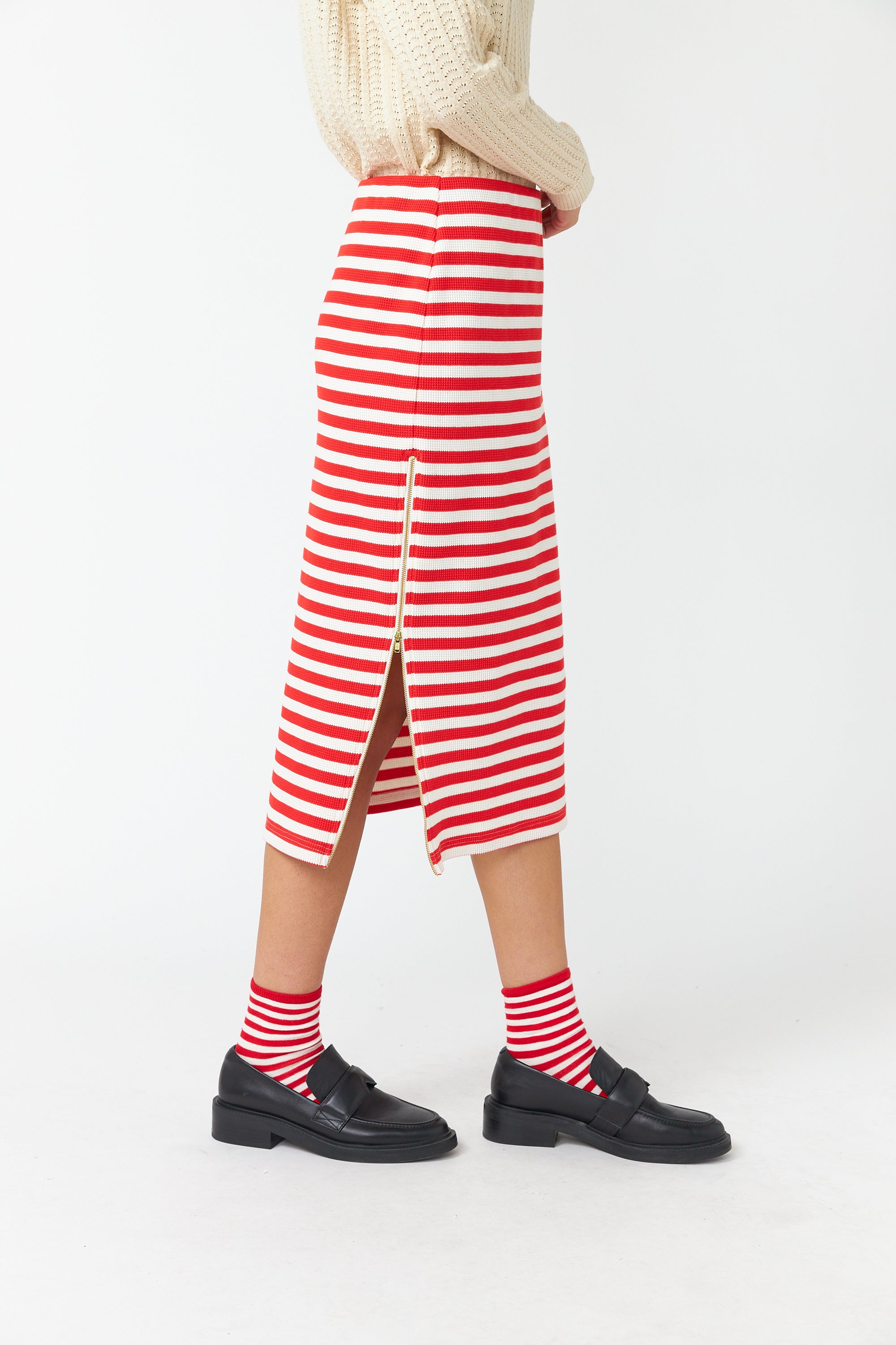 The Stripey tube skirt has an elasticated waist so it can sit on the waist or hip. This skirt is mid-calf and has an adjustable zip so you can choose the length of your side split. Worn here with the Traveller shirt or pair with our matching hoodie.Navaeh is 5'8 and wears size 8.