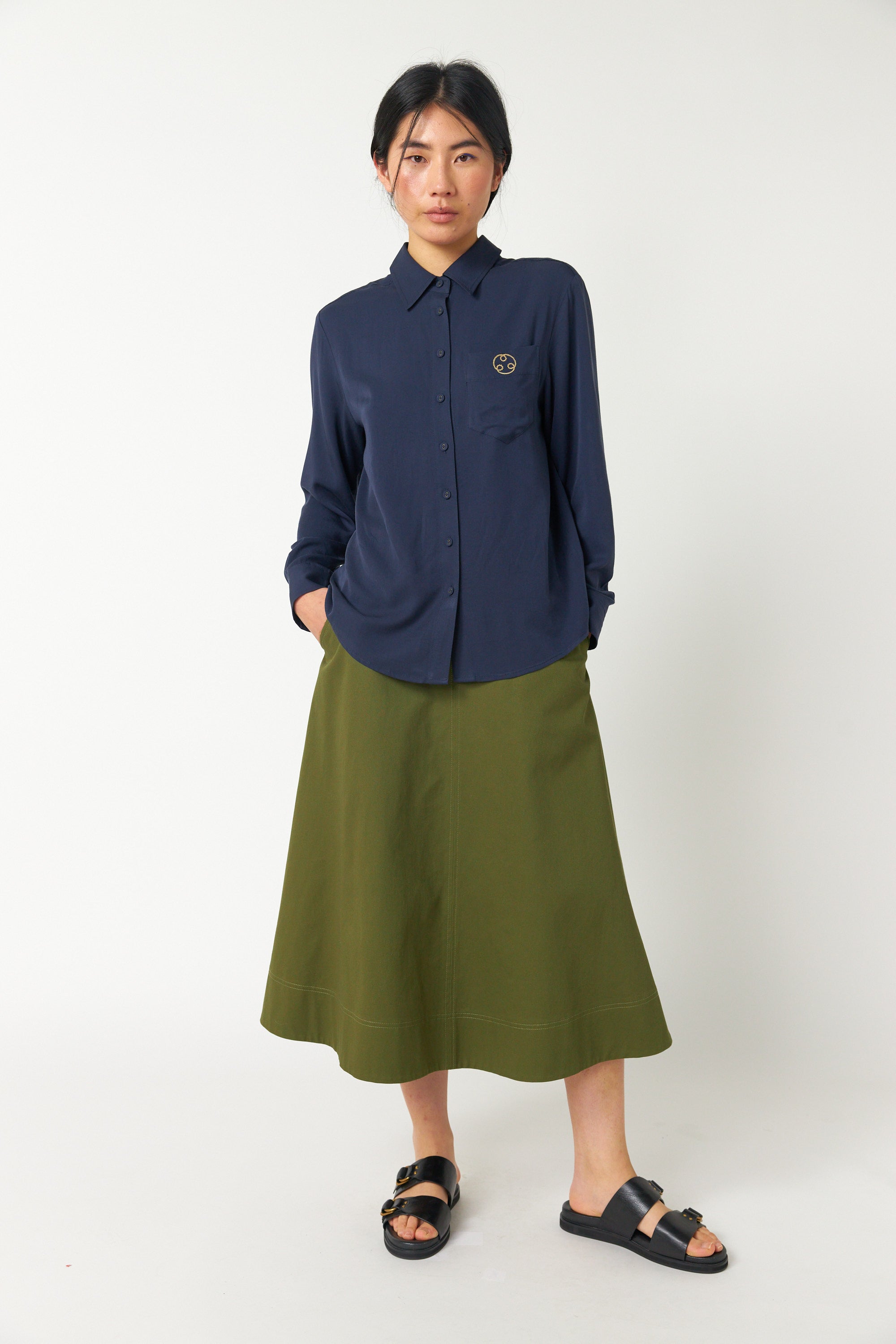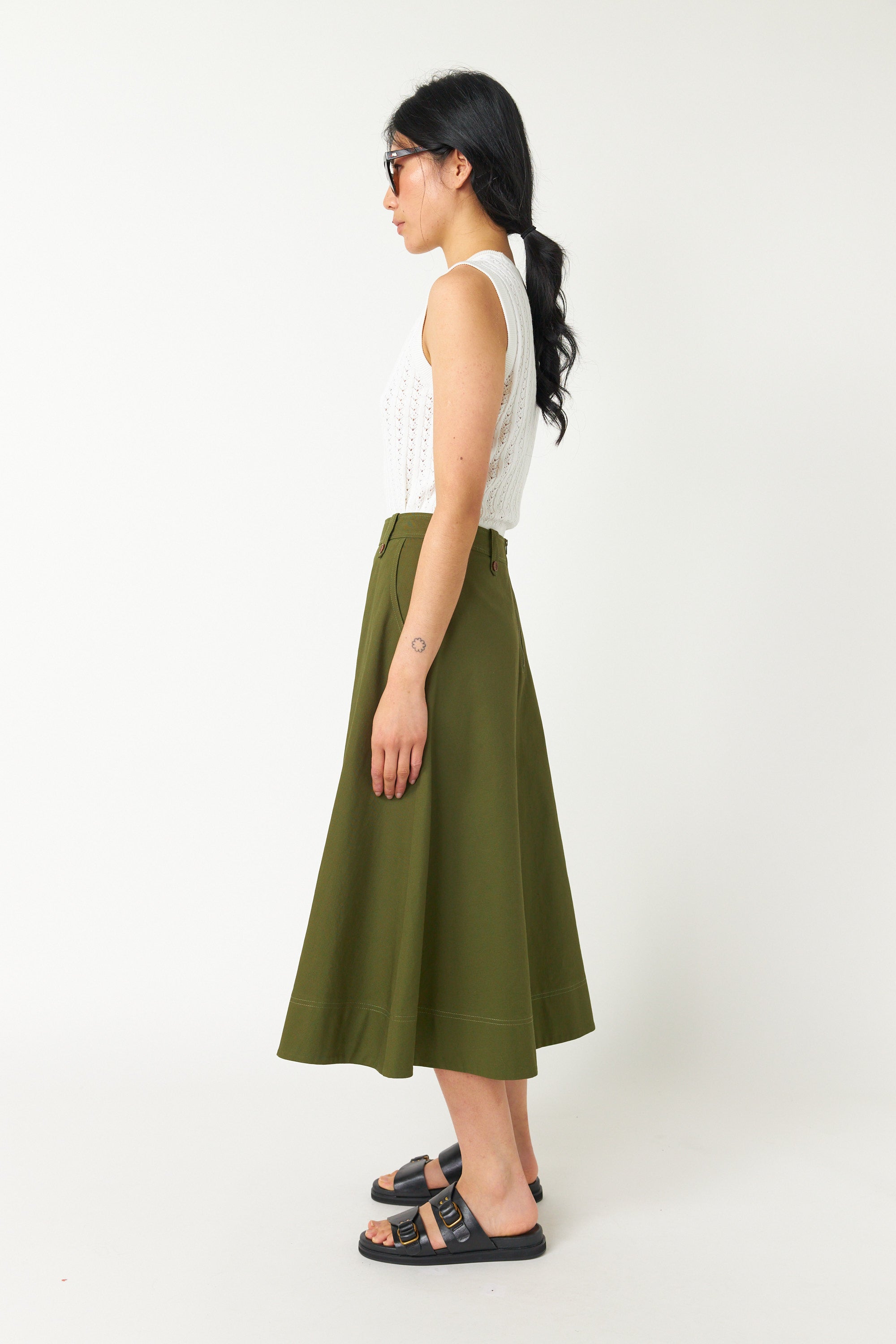 Our Workwear skirt is very flattering. Made of 100% cotton, this skirt features contrast buttons on belt loops, a rear zip closure, and helpful angled front pockets. We suggest pairing with the or for those glorious spring days, it also makes a great suit with the matching and .